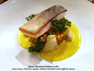 My salmon was delicious. Fresh with that Spanish hint from the chorizo and saffron sauce, the couscous on point, and all the seafood flavour. Really enjoyable. I asked for a side of vegetables for us all, as I normally do at home.