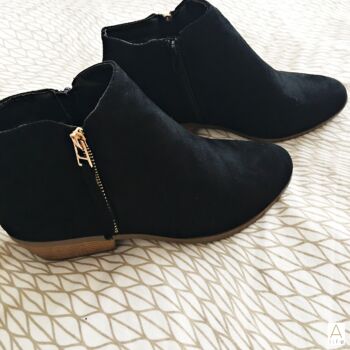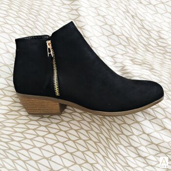 These low ankle boots, with the outside zip in gold, is simple yet elegant and comfortable.