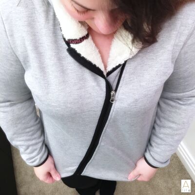 Love the fact that the zip is not the normal “centered” one, and this jacket is great after training and coming home or to wear at home or use daily (when the warmer weather, of course, lets me). This is size 20, even though I am an 18, but i thought that it had the interior fur, and I was right. Buy a bigger size than you normally wear.