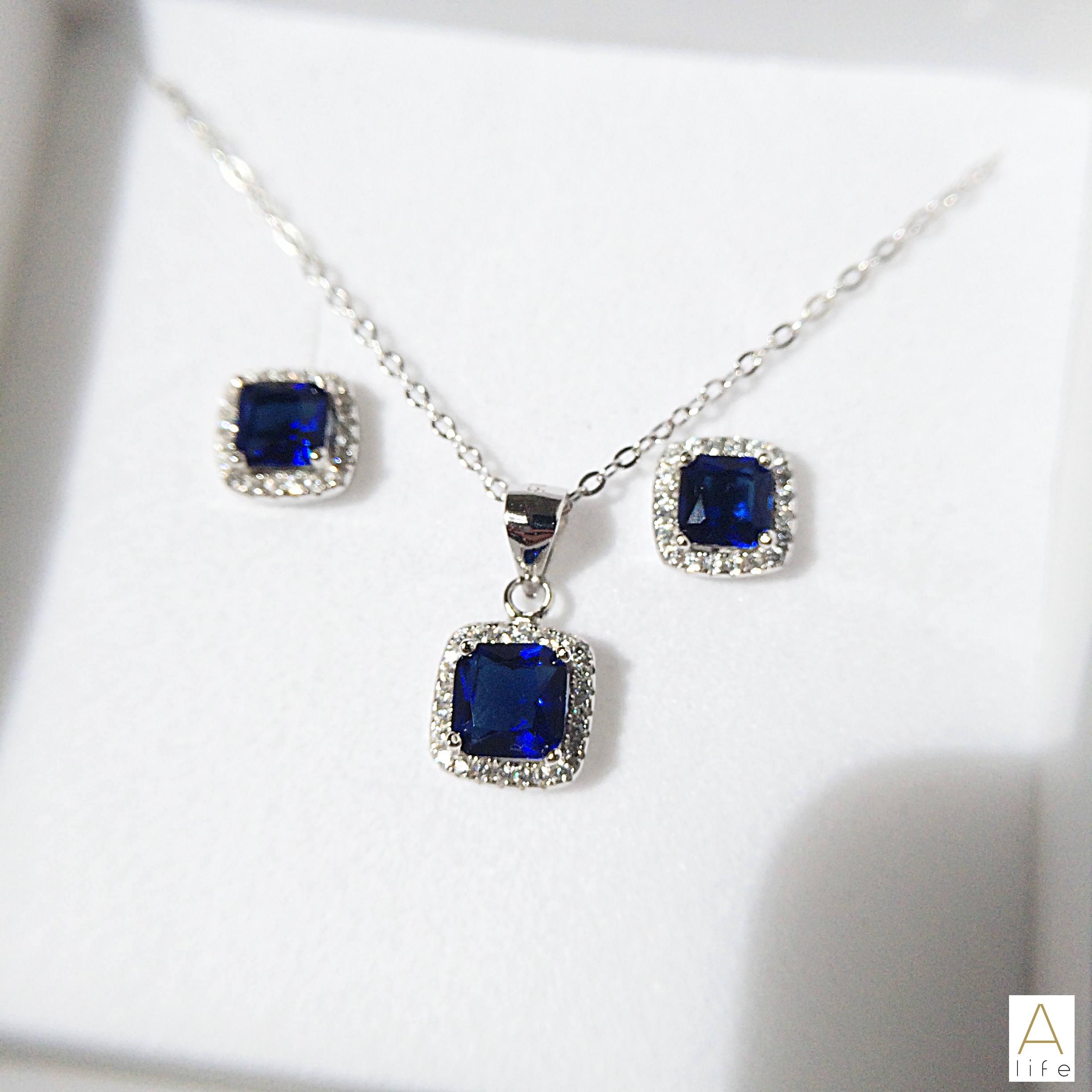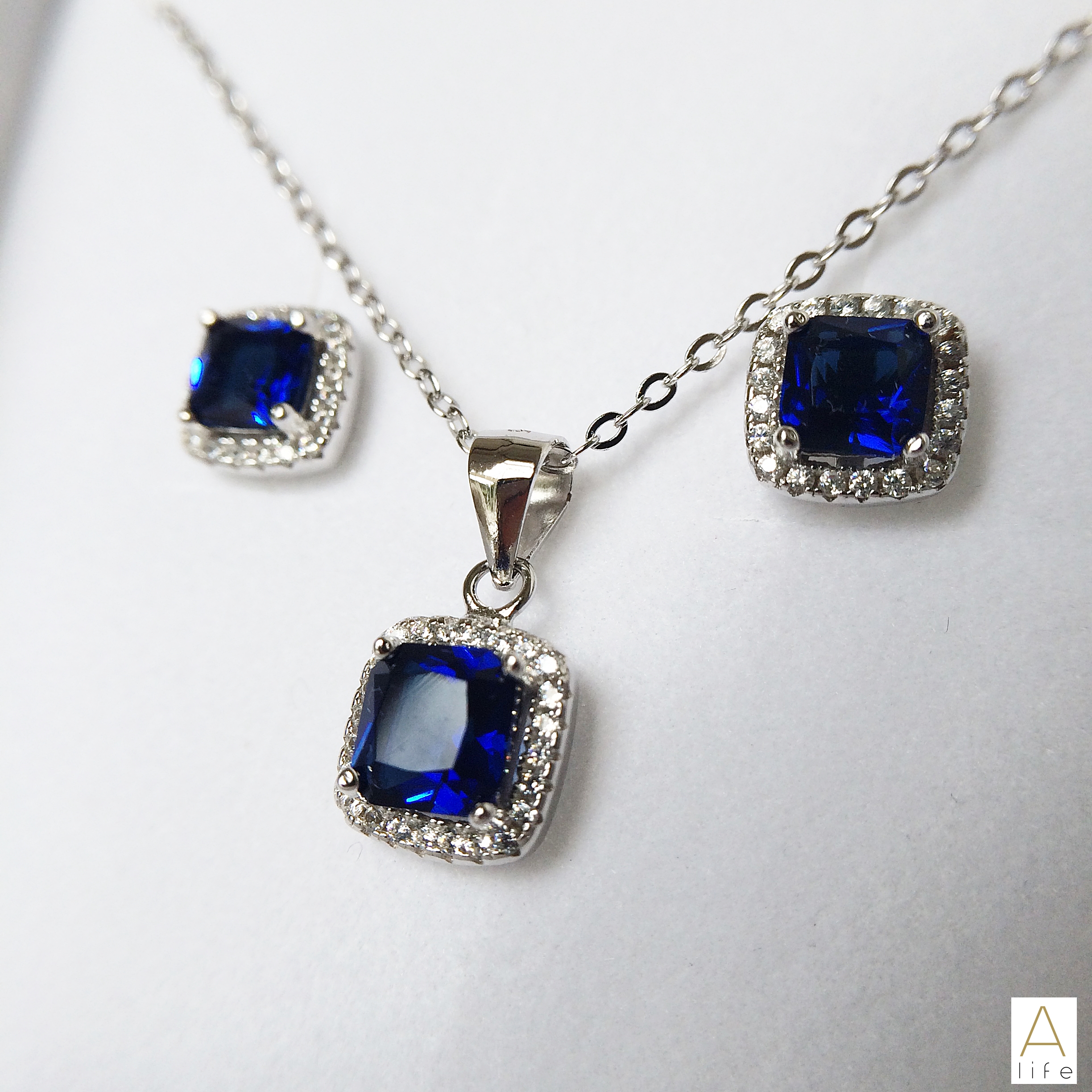 Crafted from Sterling Silver, features a matching pendant and stud earrings with an opulent blue cushion cut crystal, embellished with sparkly clear cubic zirconia.