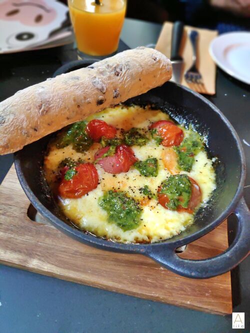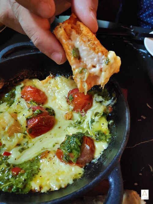 Grilled Argentinian cheese, chimichurri & tomatoes (Vegetarian) — Oh my goodness! Calling all cheese lovers out there, this with chimichurri is an absolute treat! The fresh baked bread contains olive pieces.