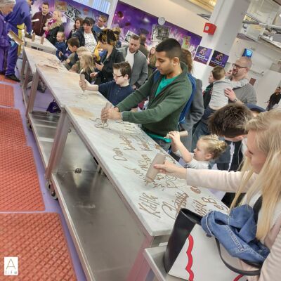 You will have fun rides such as the Cadabra or the 4D (we loved it) outside and make your own name in chocolate… And yes you can taste the chocolate and see real artisans working and take fun pictures on the Green screen. And of course, have fun in the Purple room with all the fun tech and cool lights.